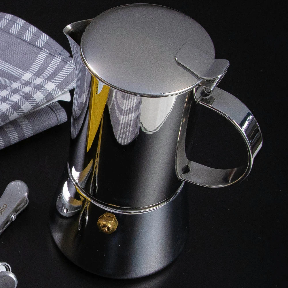 The Cilio 8.5 fluid ounce Aida Stovetop Espresso Maker brews the perfect cup of espresso easily on your stovetop, and its mirror-finished stainless steel is both practical and elegant – looking right at home in the kitchen or on your breakfast table.