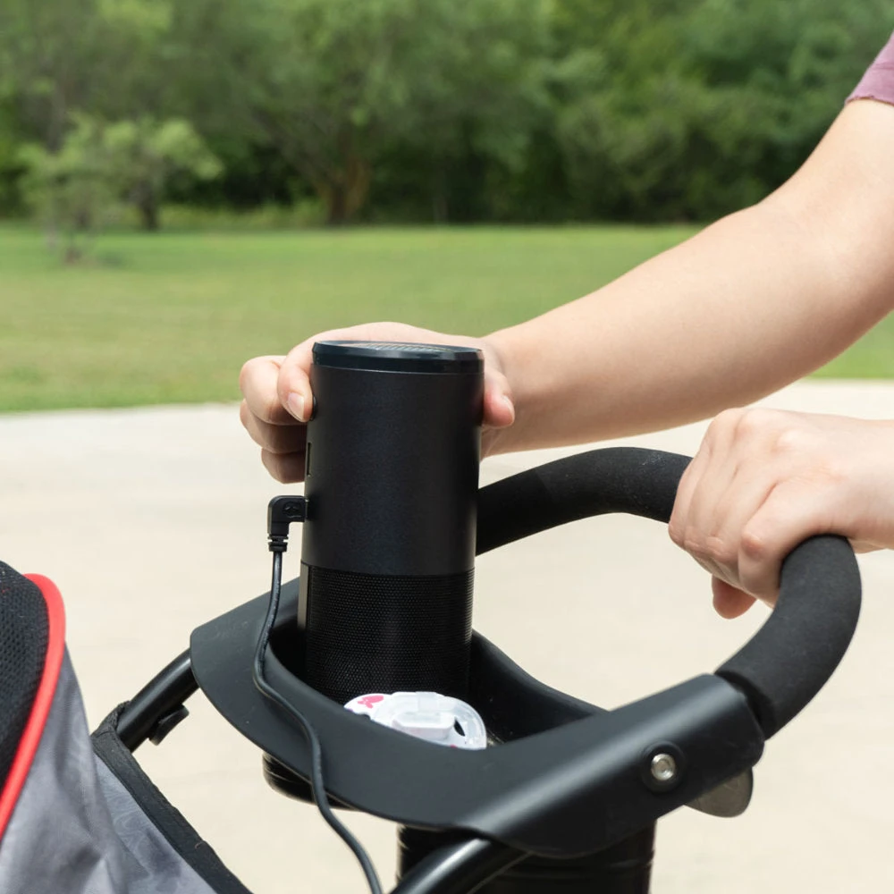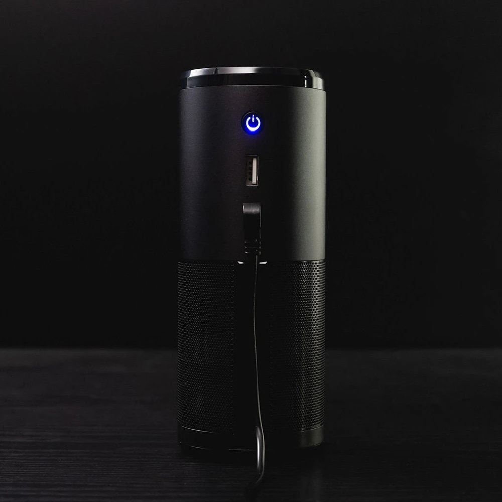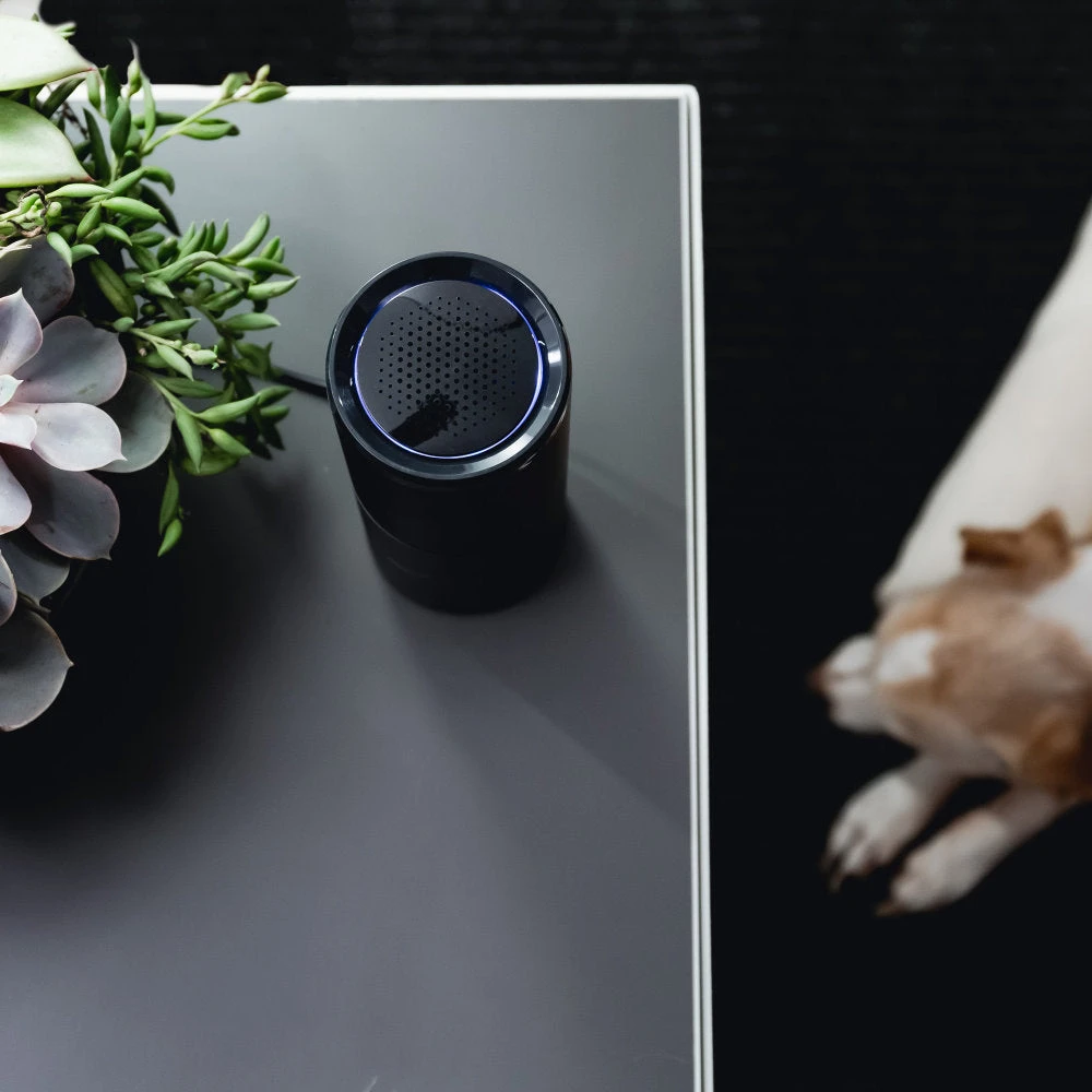 This compact air purifier is the size of a water bottle, and weighs under a pound. It is small enough to fit in your cup holder, but large enough to purify up to 161 square feet. It features both low and high fan modes, both of which are under 27dB.