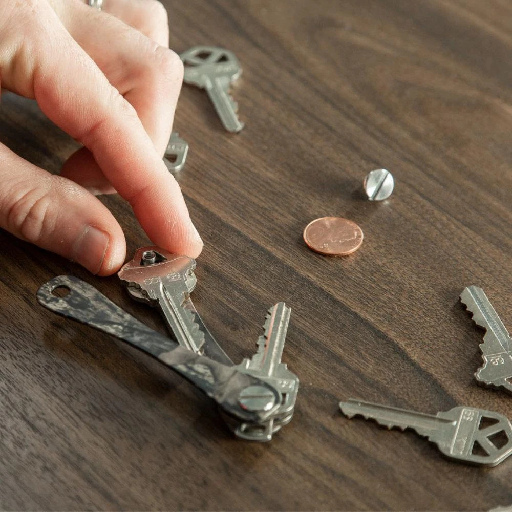 To load your keys into the KeySmart, simply place the back plate on the table with the posts facing up, stack your keys on the post, put the top plate on, and tighten with a coin. There is no need for fancy tools – just pocket change.