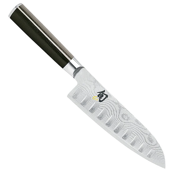 The Shun Classic 7.5-inch Santoku Knife is an all-purpose kitchen knife with a name meaning “three virtues.” The “three virtues” of the Santoku Japanese blade shape are twofold: referring to the three types of food the Santoku is designed to prepare – vegetables, poultry and fish – and the three types of cuts at which it excels – slicing, dicing and chopping. The hollow-ground indentations (also known as granton edge) on the blade reduce the friction between the blade and the food, allowing the blade to glide through even usually-sticky potatoes, and also creating pockets of air so the knife releases the sliced food from the blade more easily.
