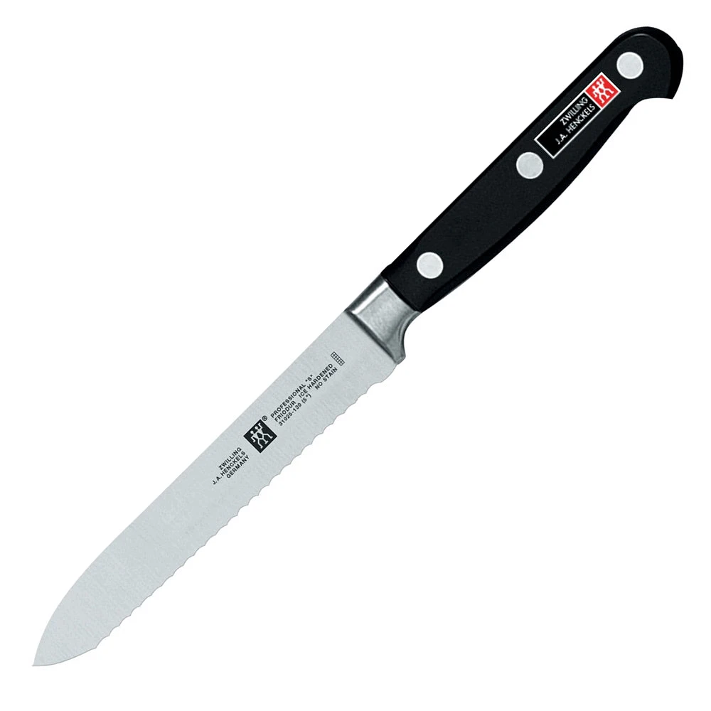 The Zwilling TWIN Professional “S” 5″ Serrated Utility Knife is ideal for tomatoes, salami, croissants and other small foods with hard crust or skin. The sharp, serrated edge makes the job of cutting juicy or soft vegetables, fruits and baked goods easier.